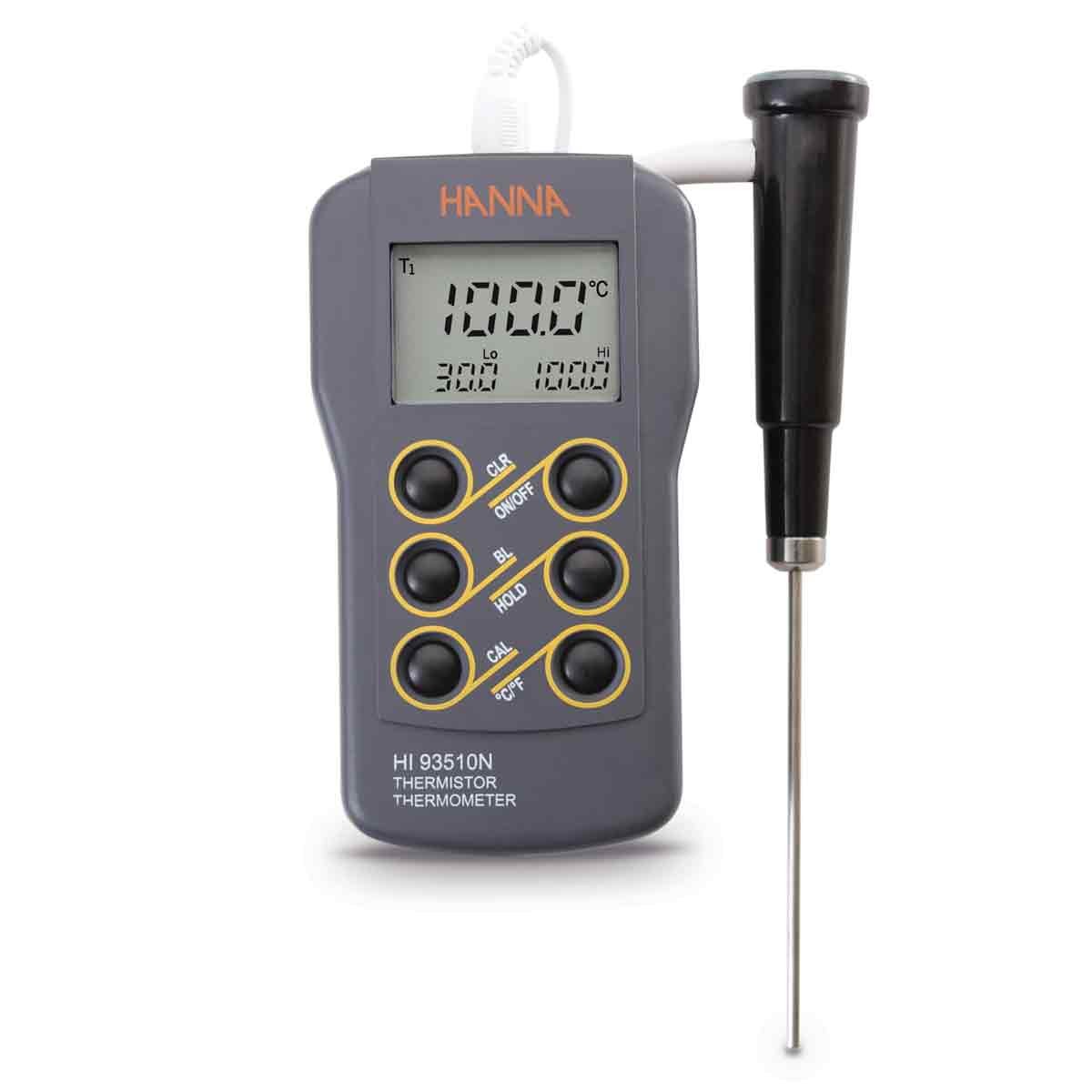 The Waterproof Thermistor Thermometer – HI93510N is a rugged meter that can be used indoors or outdoors with a wide variety of thermistor probes. The HI93510N offers features such as a backlit display, a selection of Celsius or Fahrenheit units, hold function, low and high reading display, and Hanna’s Battery Error Prevention System (BEPS) that will shut the meter off when the battery power is too low for an accurate measurement.